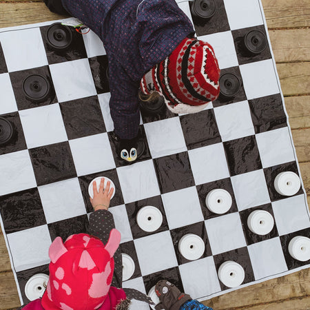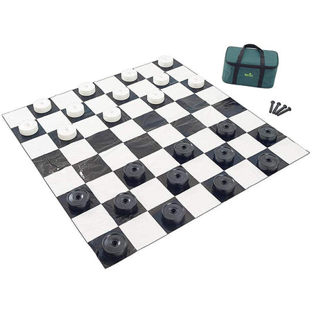 The large children's checkers game is perfect for teaching children the game of checkers. They can play anywhere indoors or outdoors and store easily in the carry bag. The bag contains all checker pieces and the 4' x 4' mat