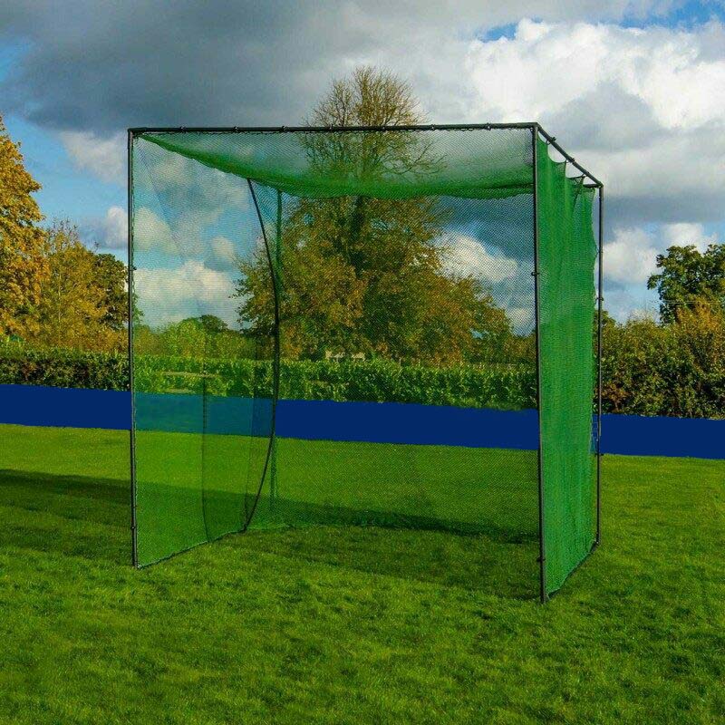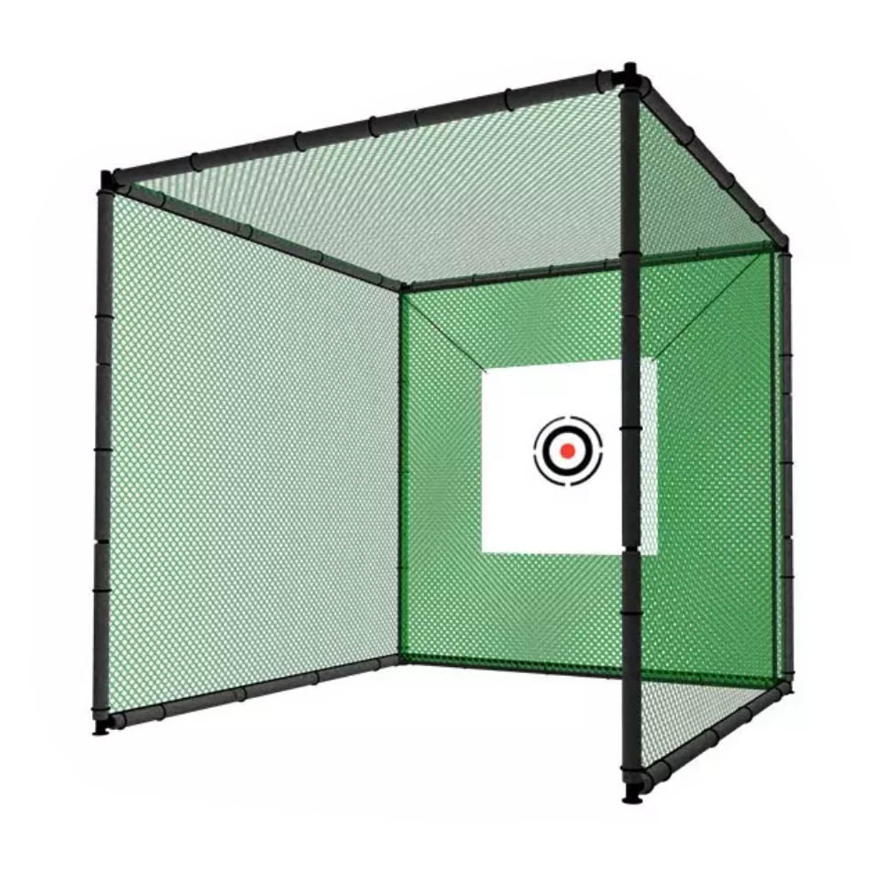 Easy-to-install pro golf cage perfect for practicing your swing in your backyard or warming up before a game. Steel structure painted with sandblasting and net resistant to the sun's rays. 2.3mm net with a double bottom. 10ft L x 10ft W x 10ft H. Weight of 110lbs, recommend dismantling or securing in high winds.