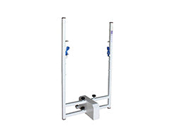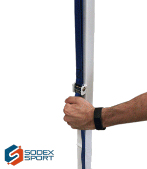 Central mobile competition badminton posts, in square steel 40 x 40 mm with double uprights adjustable in height from 1.40 to 1.55 m, counterweight 47 kg, white powder coating, use with net tension by ratchet strap.