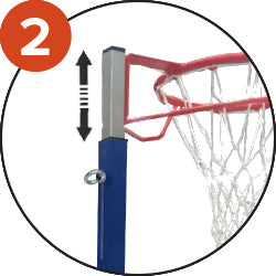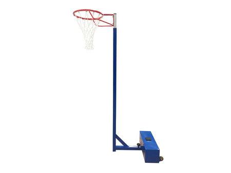 Movable basketball post adjustable ring heights. Made of 50x50mm blue powder coated steel. 18mm solid steel pipe with 2 reinforcements. Adjustable height 3.05m / 2.10m thanks to the tightening screw. Supplied with: Ring, Net and empty counterweight base. The PVC wheels make it easy to transport the goal.