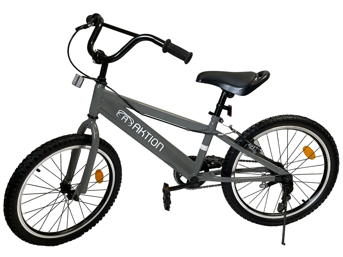The gray bike with 20 inch wheels is ideal for ages 5 to 10 depending on your child's height. The bench is adjustable, the brakes can be operated from the rear (retro-action). Safety first, there are front and rear reflectors, in the wheels and on the pedals. 20'' wheels with a manual brake on the right front handle. Handle on the back of the bench to help parents when learning!