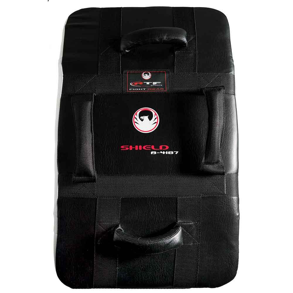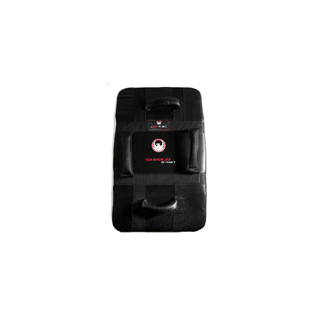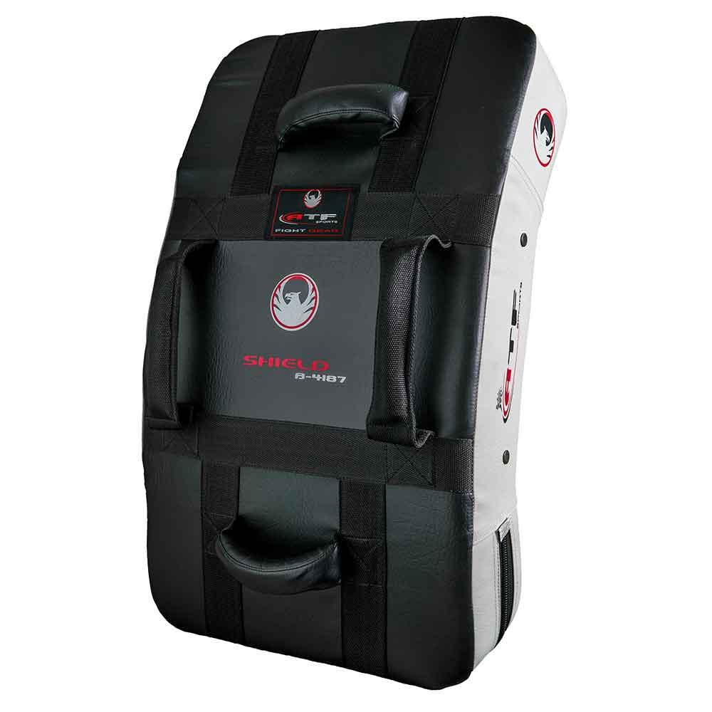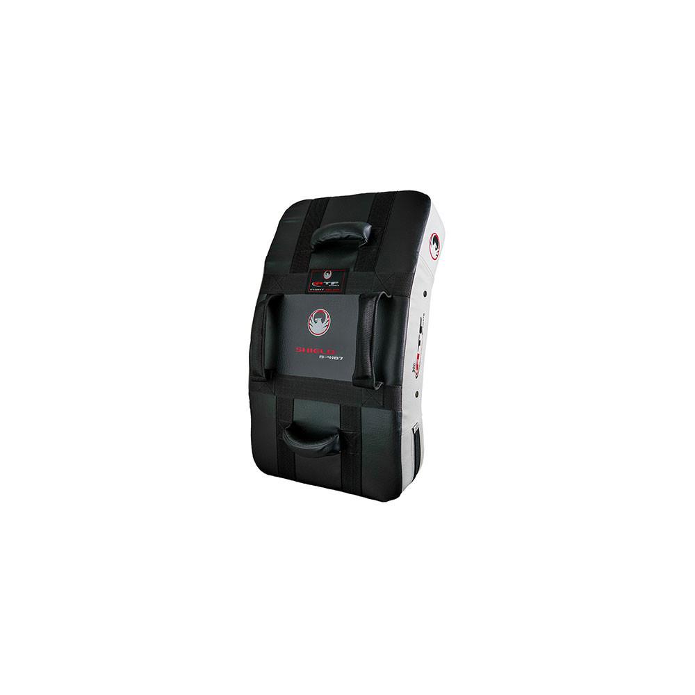 Made of 4" or 5" thick PVC foam and covered with laminated leather. the cushion is light and diffuses the impacts. The 4 handles give flexibility for different attack positions. They are reinforced for durability. Choice of two sizes 18" x 13" x 4" and 24" x 16" x 5". Attractive MMA style black and white design.
