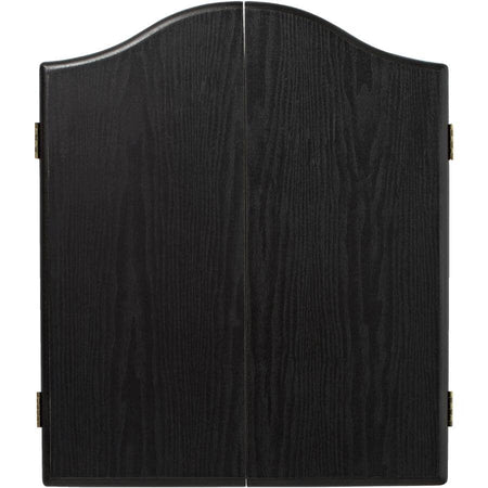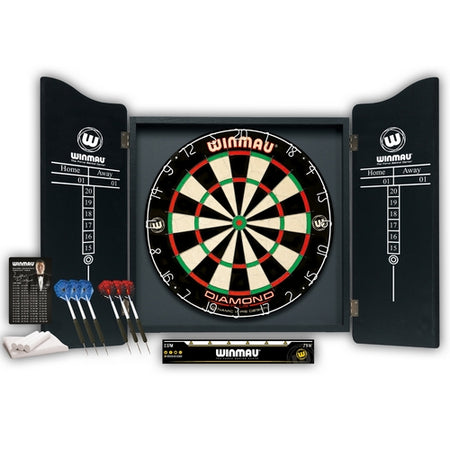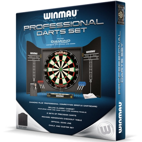 The Professional "Winmau" Dartboard and Cabinet Set includes an 18" dartboard, an ash colored wood cabinet, two sets of bronze coated steel tip darts, game boards with chalk.