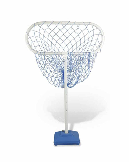 The white frisbee goal with a blue net is resistant and durable. The base of the goal can be filled with sand or water to anchor it to the ground. The goal has an adjustable height between 52", 56", or 60".