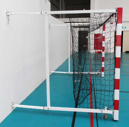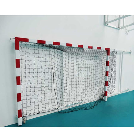 Folding handball goals on the wall. Non-monobloc facade in galvanized steel 80x80mm.