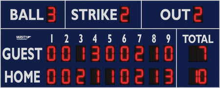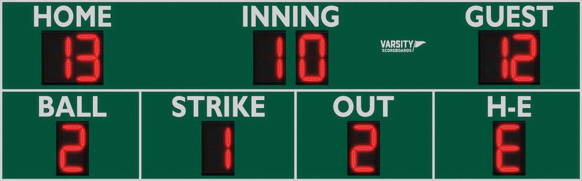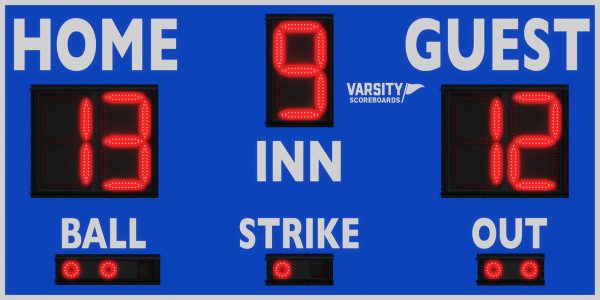 Exterior Scoreboard. Compact Varsity Outdoor Scoreboard features 15-inch LED digits and displays all basic game information. 15-inch LED digits with protective screens. Galvanized steel cabinet with powder coat finish. Wireless remote control with internal rechargeable battery. Dimensions 8′ x 4′ x 8″. Weight 150 pounds.