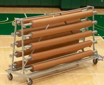 Floor covering cart. Mobile storage support system. An exclusive roller support with steel ball bearing design integrated into a 4-wheel bearing setup. Increases load capacity on each support. Enables smoother operation of installation and retrieval of each gym floor covering section. Increases the robustness of the rack. Innovative 8″ diameter non-marking poly wheels. Increases total load capacity to 4,000 pounds. Facilitates easier movement for installation and retrieval. Can hold up to 10 rolls.