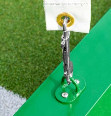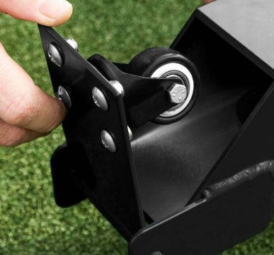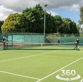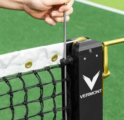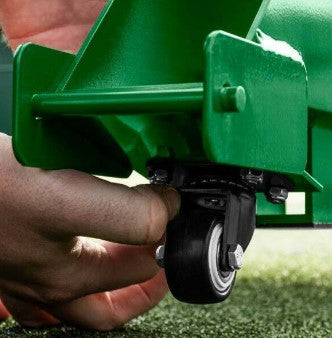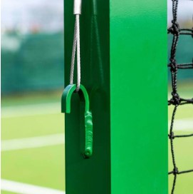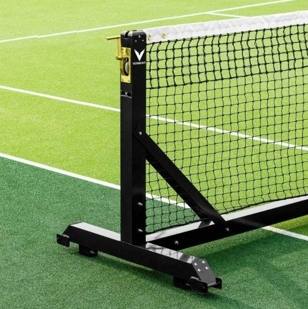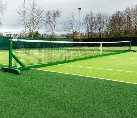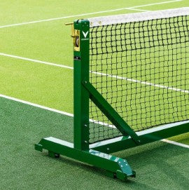 Tennis post system without anchors can be transported and stored as needed. Made from quality aluminum. Posts easily adapt for 33' singles or 42' doubles play. Available in green or black. 360 degree retractable wheel system for easy movement. Rubber feet that do not mark surfaces. Can be used indoors and outdoors. Center strap eyelet. Brass winch. Net and strap not included.
