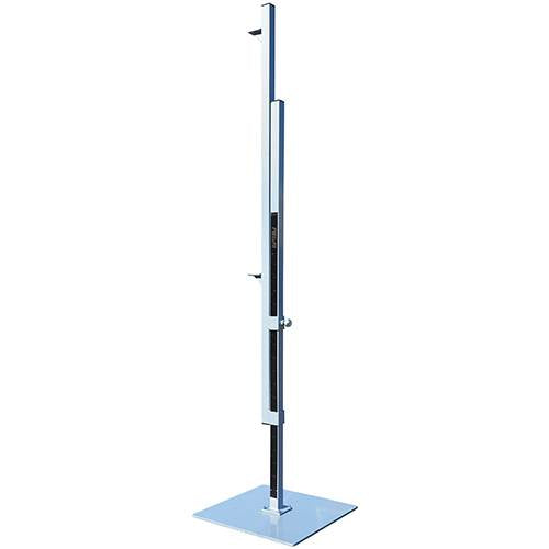 Made of steel with silver spray paint. 18" base for optimal stability. Height adjustment from 2' to 8' and metric equivalence. Meets Federation standards.