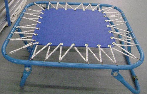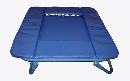 Our professional quality small trampolines are used by gymnasts and circus athletes. The shock cords, springs and bed are top quality. 2" thick cushioned surround, angle adjustable legs.