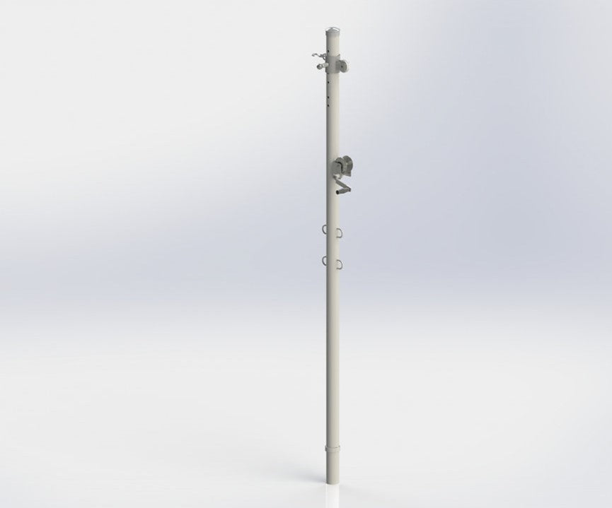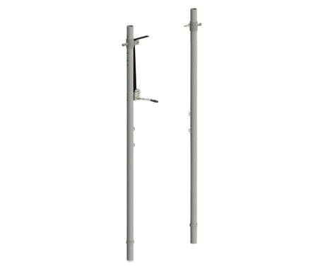 3.5-inch galvanized steel volleyball posts. Features a winch on one side with a mount on the other post.