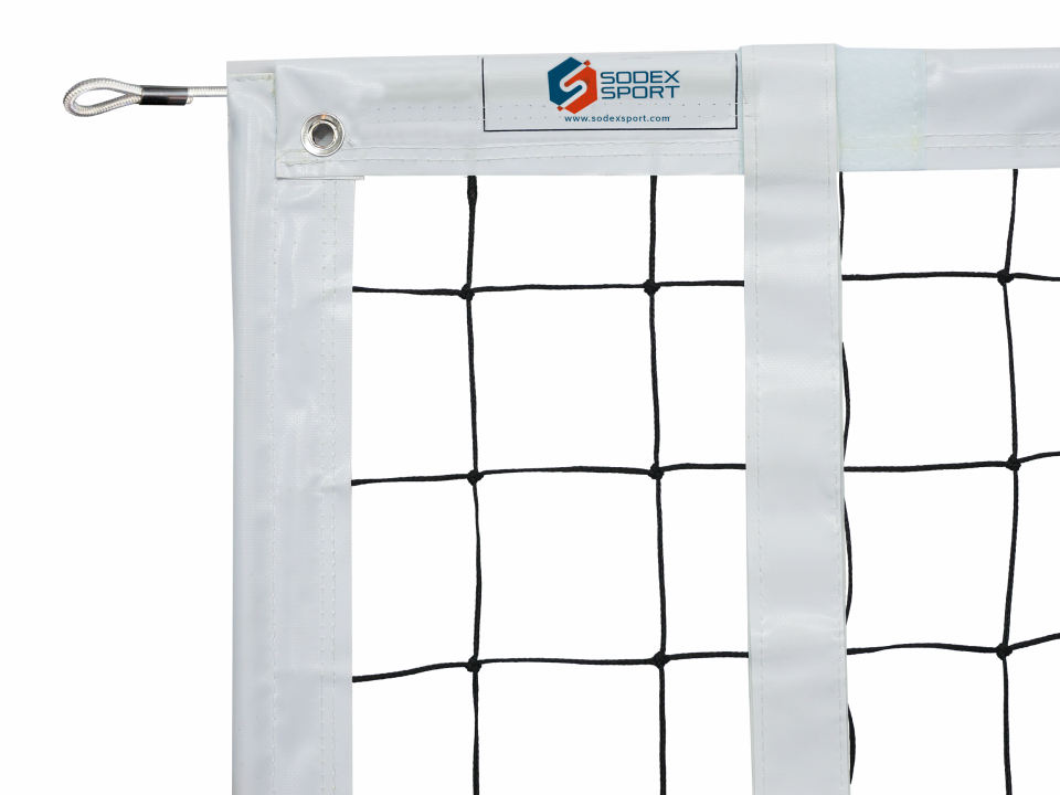 Kevlar cabled competition volleyball net made from UV-treated high-density polyethylene, woven with a diameter of 3 mm. Tensioned with a 5 mm diameter Kevlar cord. White PVC edging.