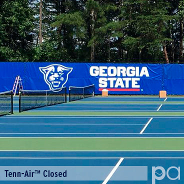 The Tenn-Air Windbreak Fabric is durable and resistant to all types of damage, providing complete wind blockage. Ideal for indoor and outdoor tennis courts, partition curtains, sports field covers, or other applications requiring 100% privacy. Provides 100% privacy blockage with no airflow. Made of 10 oz vinyl-coated polyester mesh. Reinforced 3-layer hems with integrated brass grommets every 12". Available in 6' and 9' heights in dark forest green or purple.