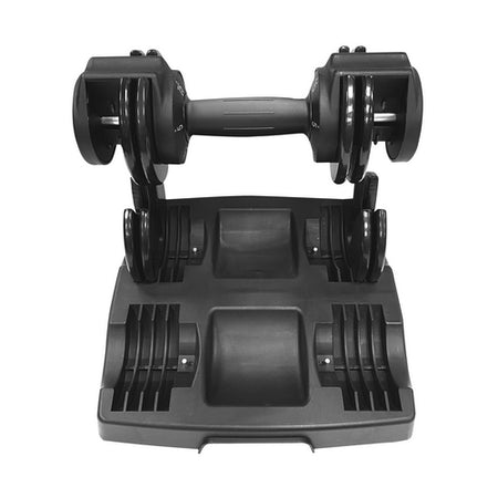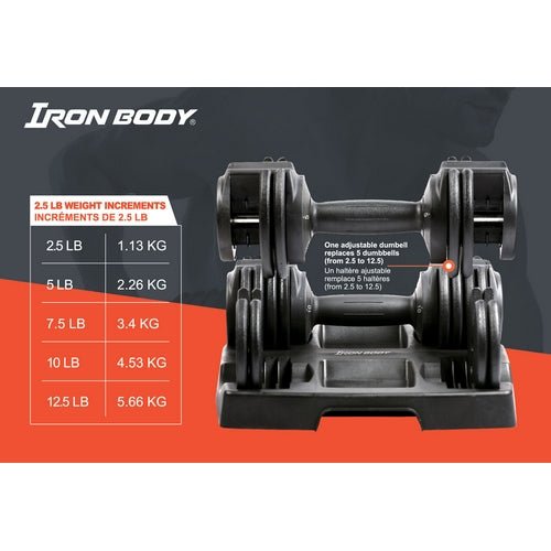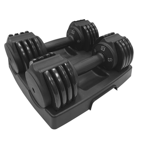 The 25lb set of adjustable dumbbells is perfect for your workout at home or in a small gym. It does not take up much space and easily adjusts to the desired weight. Each dumbbell has a total weight of 12.5lbs and adjusts with a simple twist to add or remove 2.5lbs. So you can do 2x 2.5lbs, 2x 5lbs, 2x 7.5lbs, 2x 10lbs and 2x 12.5lbs. The set comes in an easy-to-slide storage box under a sofa or in your closet!