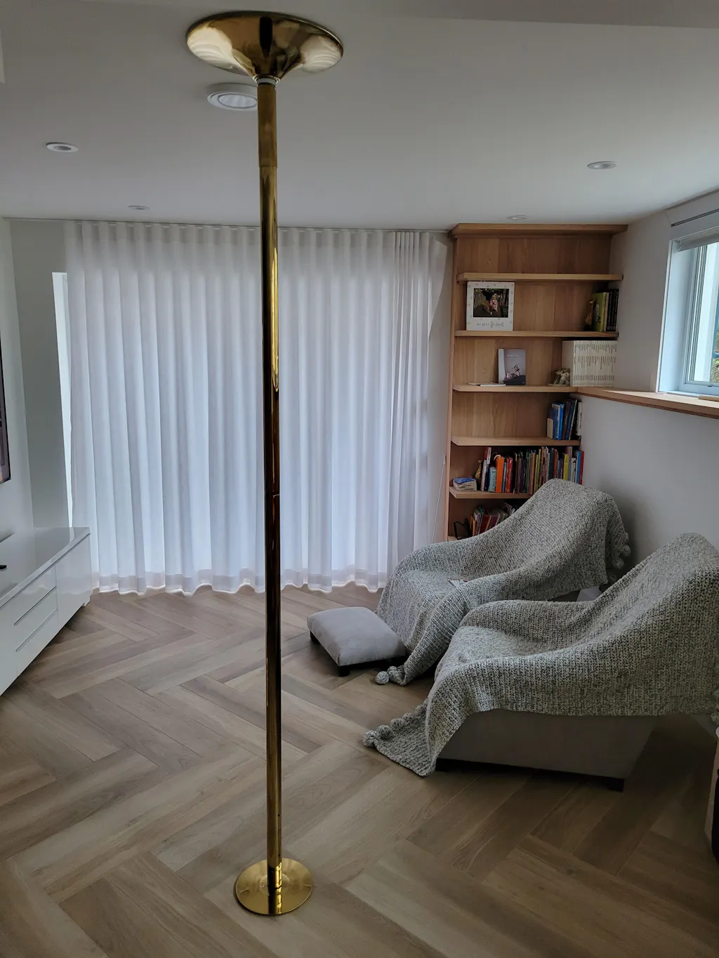 It is portable and therefore, easy to put up and easy to take down anywhere. Pay attention to the injury, give yourself enough space around the pole and don't forget to add a fitness pole mat . An essential!