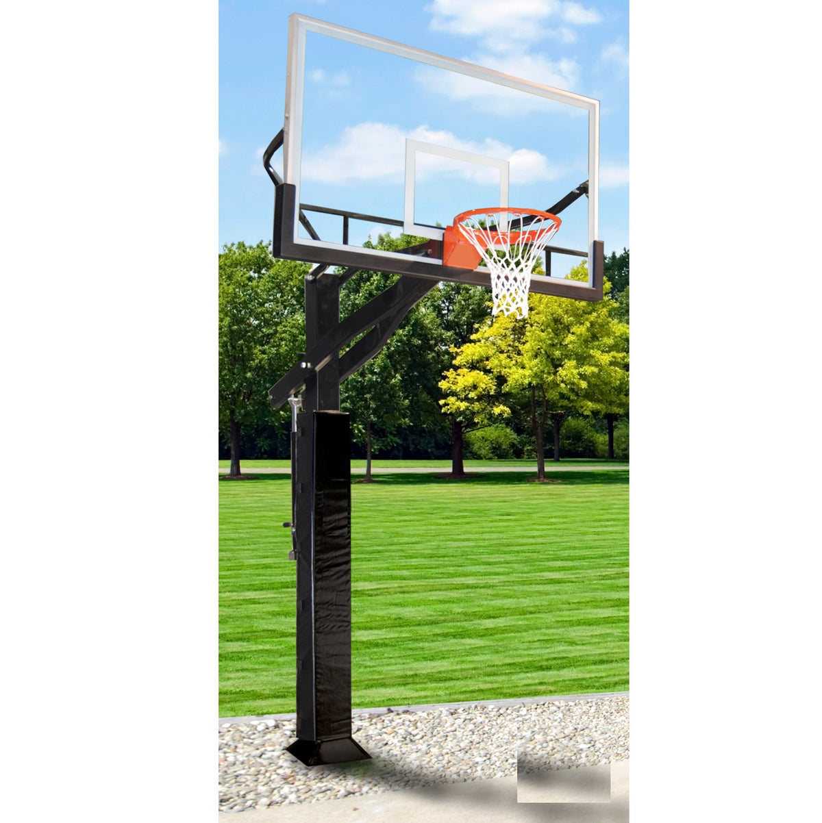The 6" x 8" pole includes a secure 48" play area, with a choice of 42" x 72" backboard made from glass, acrylic, or polycarbonate. The patented Quick-Connect™ system allows for easy outdoor installation. The premium adjustable basketball system is a popular choice for residential use, playgrounds, and recreational play environments. The actuation mechanism allows for easy rim height adjustment from 7' to 10'.