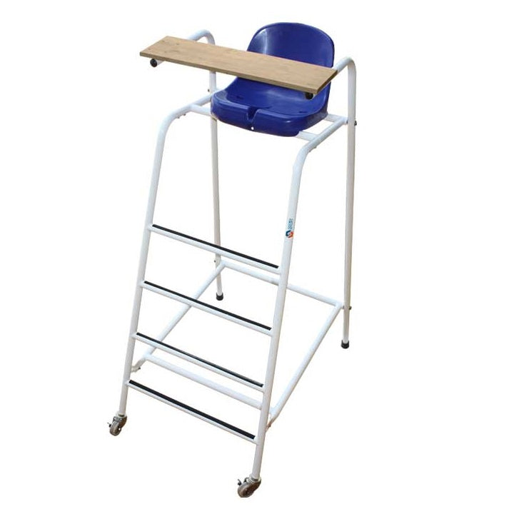 3.4cm diameter steel badminton referee chair. Ergonomic seat made of injection molded polypropylene with fixing covers. Braked wheels allow the chair to be moved easily. Non-slip ladder rung. Reversible shelf fitted with a safety device to prevent it from falling