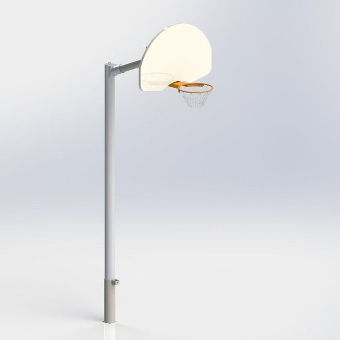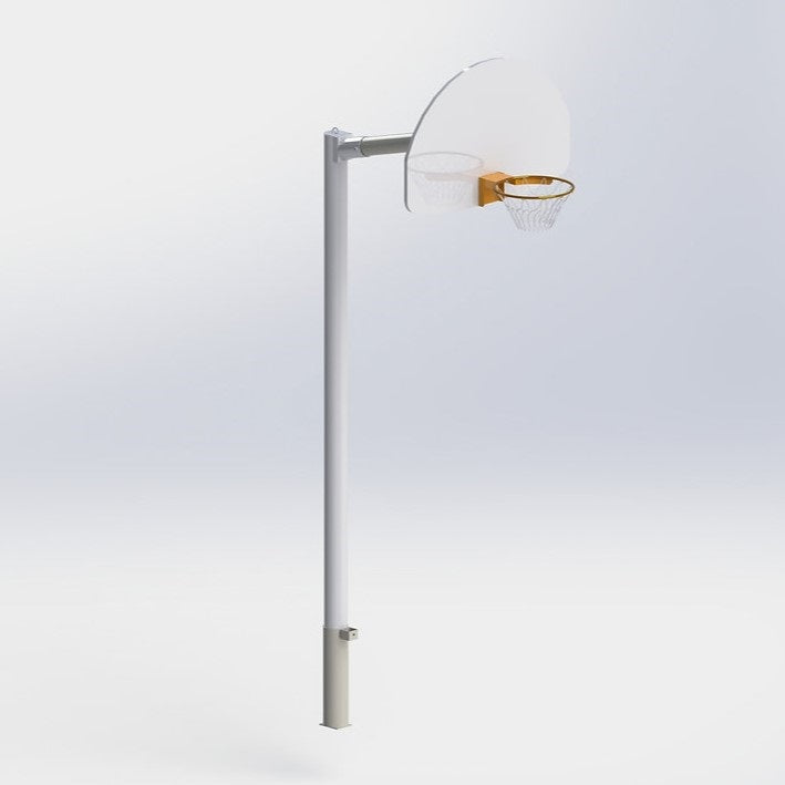 Basketball goal post with 4' extension. Choice of anchors for steel panel at the rear or in polyethylene at the front. The panels are fan type.