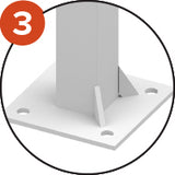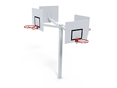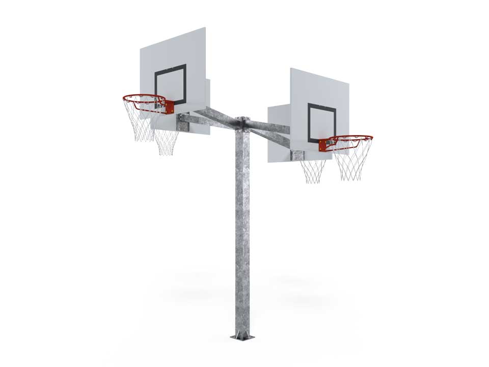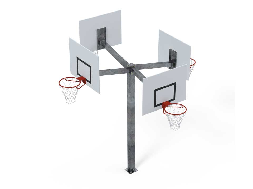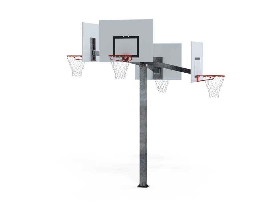 Our multiple basketball hoop systems are made from galvanized steel. 5.5" square posts. Screwed into a concrete base with a ground plate. System with 4 panels and hoops at two different heights. Adjustable from 2.6m to 3m.