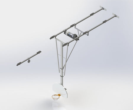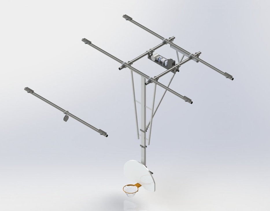 Ceiling structure for basketball hoop. Electrical system with winch. Distance from 20' to 28'. Regular 3/4 electric winch. 30' anti-fall belt.