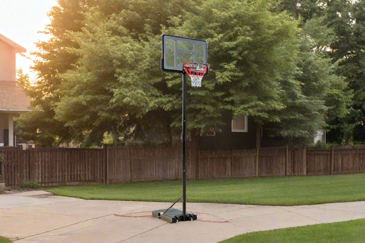Our children's basketball hoop is ideal for the introduction to basketball with your little ones. It adjusts to 1.5m in height allowing youngsters to shoot hoops and play basketball with others. The poly carbon PVC basketball backboard is very durable. The ring is made of steel installed on a 2.6" round pole. The bottom of the panel is protected by included protectors. The base must be filled with sandbag to ensure that it stays in place and does not fall.