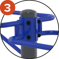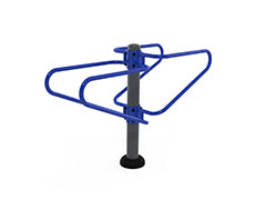 Classic parallel bars. 1.88 m long × 0.79 m wide × 1.40 m high. Anchored to the ground. Made of galvanized steel and painted blue and gray with anti-corrosion protection. Two usable bar heights: 1.2 m or 1.3 m. PVC covers conceal screws and nuts for added safety.