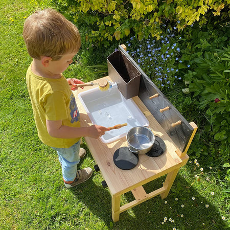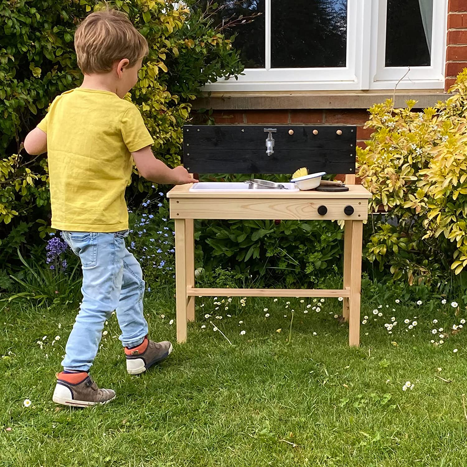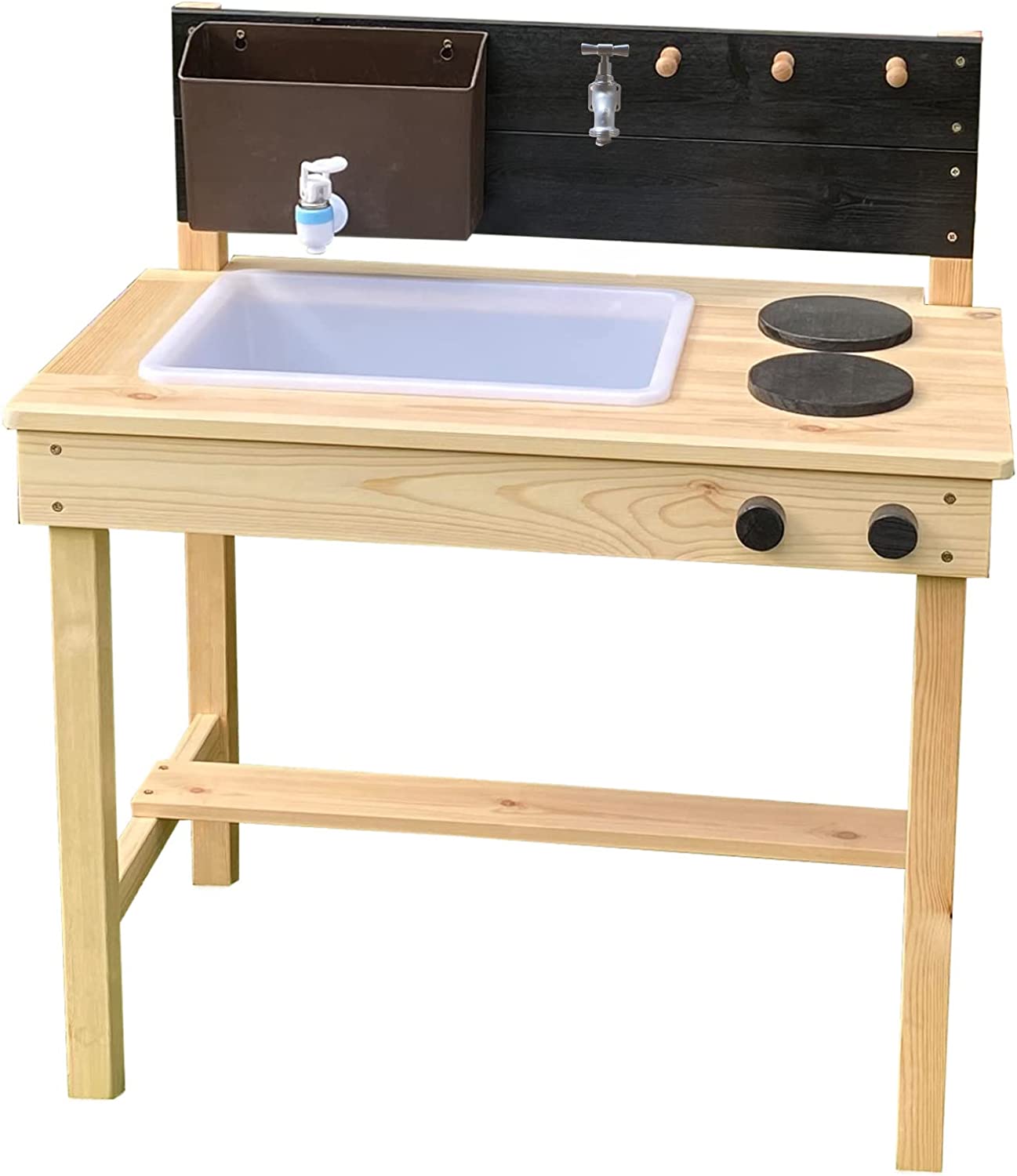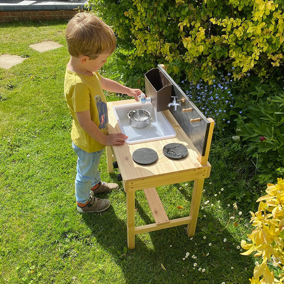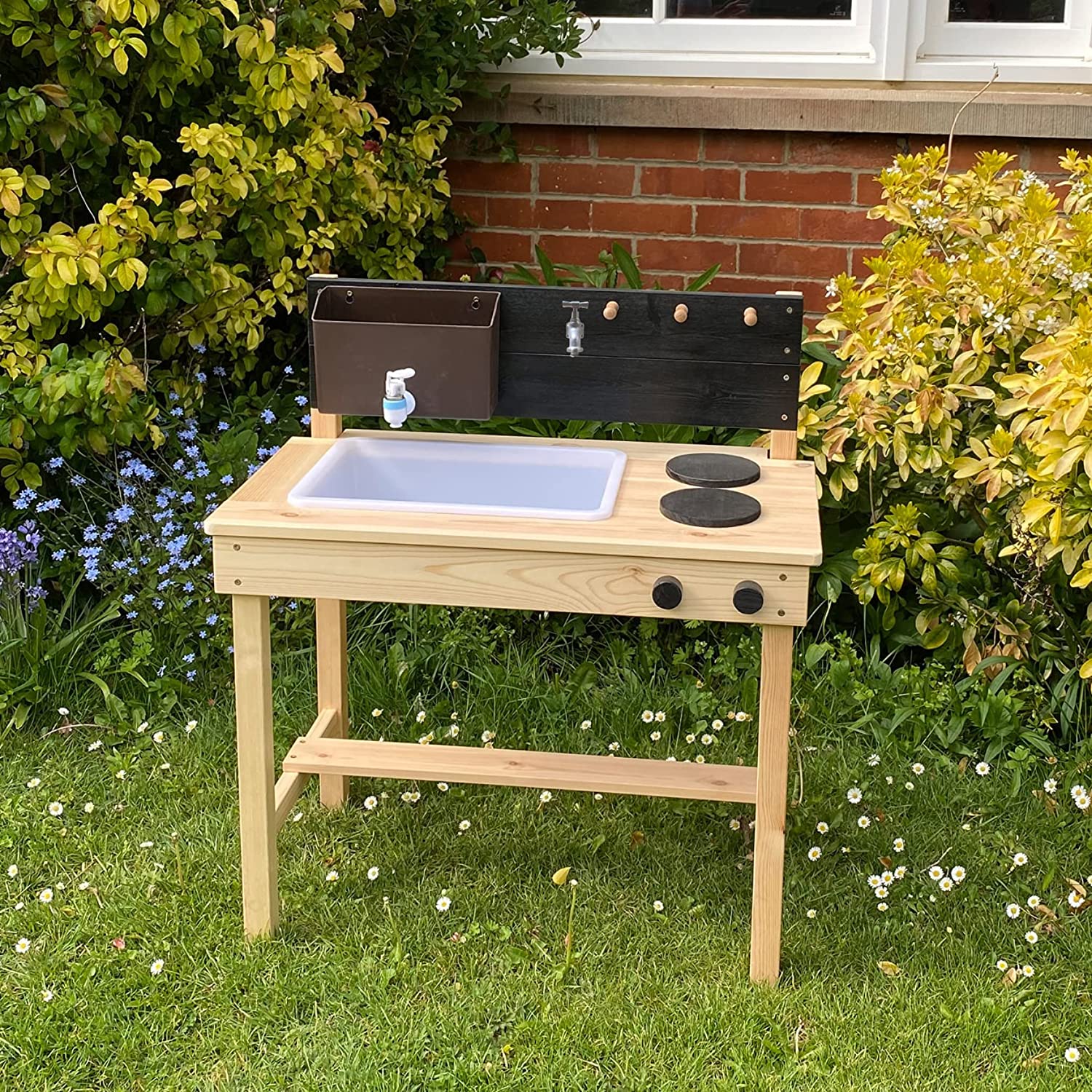 A miniature wooden outdoor kitchen for kids that provides hours of fun for children of all ages. Built to be suitable for very young children, it is easy to assemble, stable, and sturdy to prevent any breakage. It features a functional water faucet, and you can connect a hose to the back for a constant water supply.