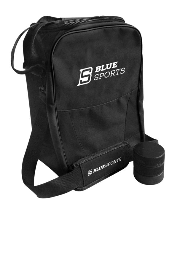 Deluxe puck bag. Made from durable fabric with heavy-duty zippers, it features a D-shaped opening for quick access. Its padded, adjustable shoulder strap ensures comfortable transport. Can hold up to 50 pucks.