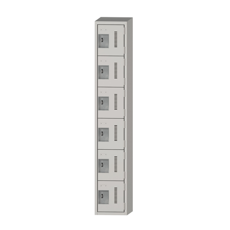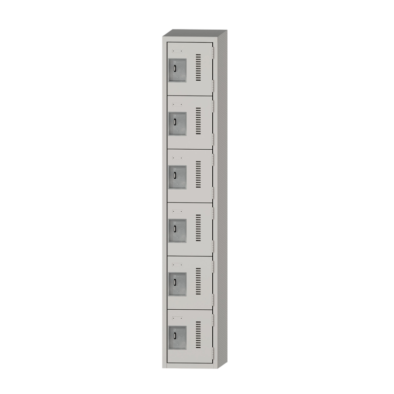 Set of six half-height lockers 15" wide and 72" total height. Metal construction made in Quebec. Each locker has its own latch. Set includes 6 half-height 36" lockers. 2 metal hooks with rounded end. Door with magnet device, air vent. Choice of three colors.