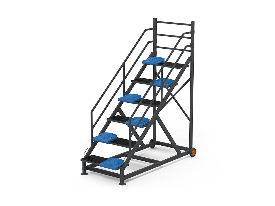 The chair frame is steel, powder coated, with wheels for easy movement. Pedestal with railing and non-slip floor.