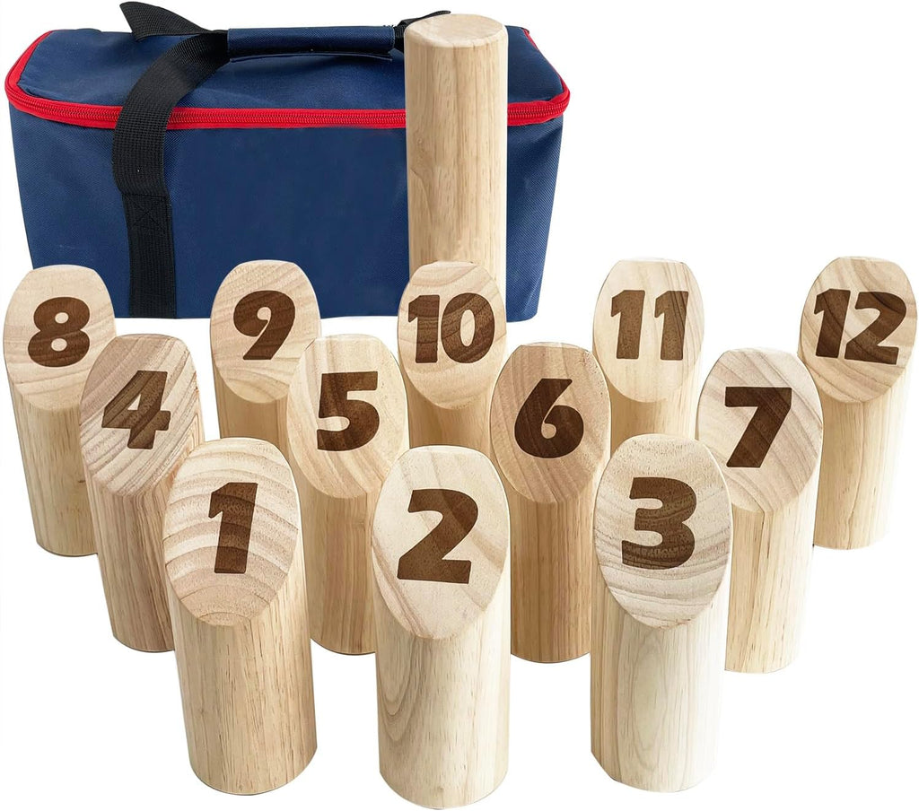 - The game includes 12 numbered skittles, 1 cylindrical throwing stick, and 1 storage bag for easy transport and storage between uses.