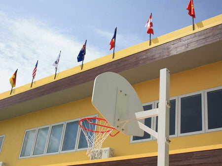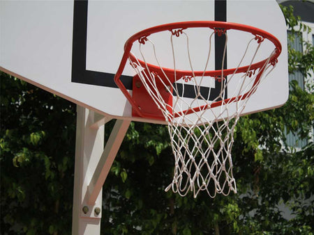 The fixed and adjustable outdoor basketball goal is a model offered with a 90x90mm post. The structure is in white plastic coated galvanized steel. The basketball goal must be anchored to the ground. Possibility of 2 play positions. Reinforced galvanized steel hook to prevent breakage and corrosion. 18mm solid steel ring with 2 reinforcements, 2 positions for adjusting the height of the ring, ie 3.05m and 2.6m.