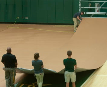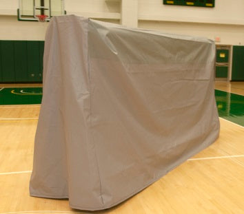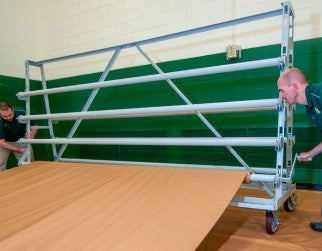 Floor covering cart. Mobile storage support system. An exclusive roller support with steel ball bearing design integrated into a 4-wheel bearing setup. Increases load capacity on each support. Enables smoother operation of installation and retrieval of each gym floor covering section. Increases the robustness of the rack. Innovative 8″ diameter non-marking poly wheels. Increases total load capacity to 4,000 pounds. Facilitates easier movement for installation and retrieval. Can hold up to 10 rolls.