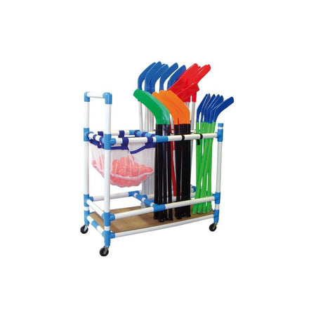 Transport cart for cosom hockey equipment. Capacity: Up to 100 hockey sticks and accessories. Can be used for other type of equipment and sport. Made of sturdy PVC.