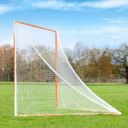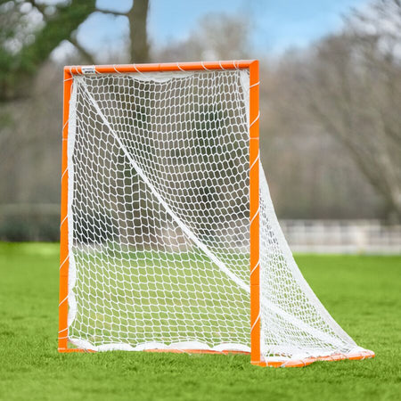 The foldable lacrosse goal, available in 4x4 or 6x6, is the perfect tool for both training sessions and recreational play. Made from 38 mm galvanized steel with a bright orange powder-coated finish, it withstands outdoor conditions while offering excellent durability. The 3.5 mm UV-protected polypropylene net is tightly laced to the frame, ensuring optimal hold and reliable rebound performance. Thanks to its innovative hinge system, the goal folds flat in seconds without the need for tools, making storage and transport quick and easy. Sturdy, practical, and simple to set up, it is ideal for schools, clubs, or home use.