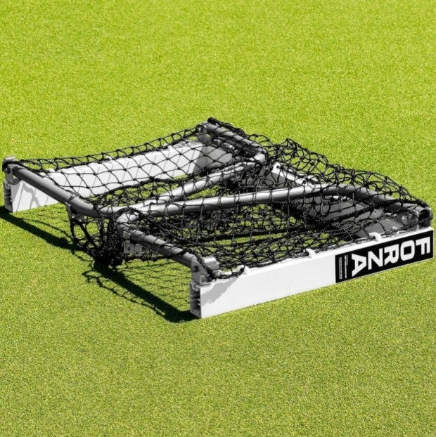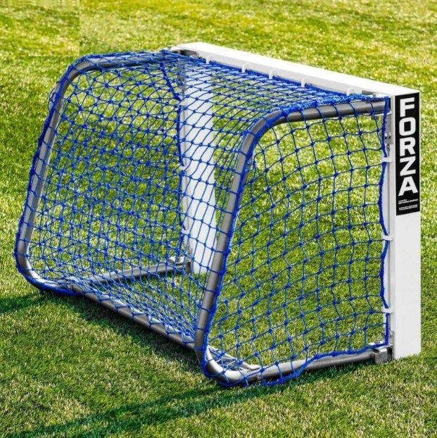 FORZA Mini Target 3x3ft football goal made from 50mm x 75mm reinforced aluminum. Foldable weather resistant goal with 3mm knotted blue HDPE football net and galvanized steel side frames and removable back bar.