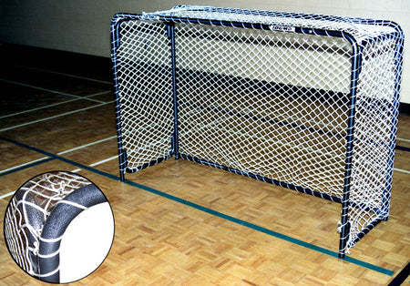 These metal cosom hockey goals are easy to store for a school gymnasium. It can be used both indoors and outdoors. Pole diameter is 1-1/4". Net included.