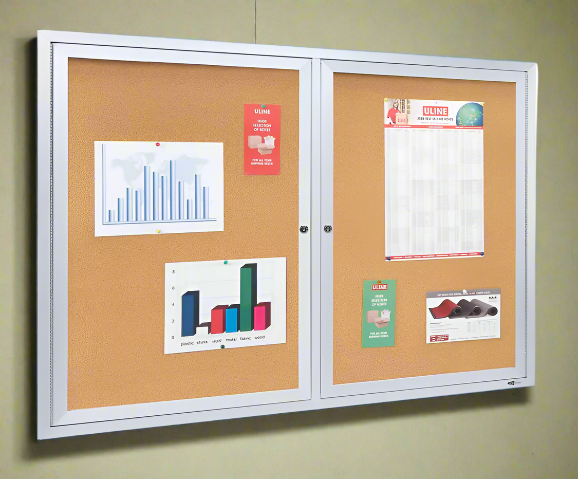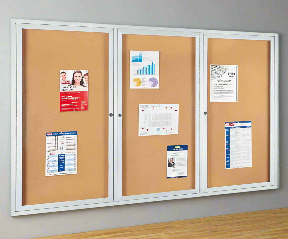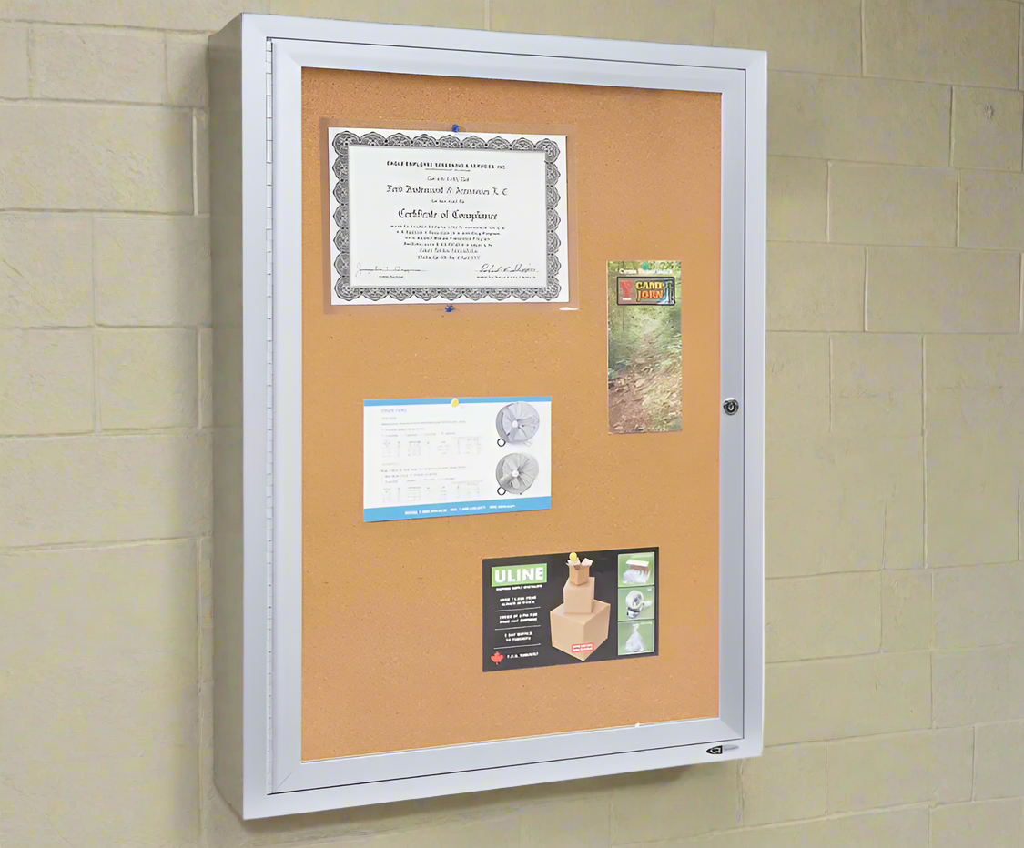 Glazed wall cabinet in aluminum frame with key door. Cork board for easily stapling notes and sheets. Comes in three sizes to choose from.