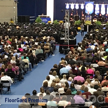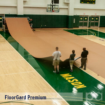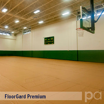 Gym floor covering made of 100% polyester coated with vinyl, weighing 21oz. Grip strength 380/380 lbs. Band resistance 265/260 lbs. Tear resistance 115/115 lbs. Adhesion 12/12 lb/in. Abrasion resistance 320 cycles. Hydrostatic resistance 600 lb/in. High-temperature resistance 180° F. Cold crack -40° F. UV and mildew-resistant treatments. Fire-rated CSFM Title 19 and NFPA 701. 17-year limited warranty.