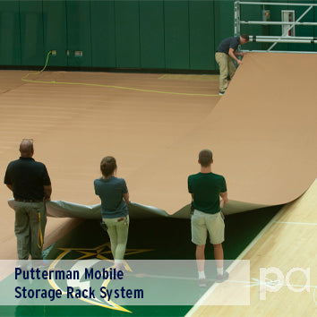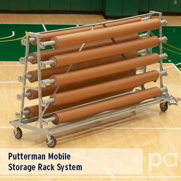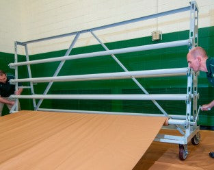 Premium Floorguard gym floor covering transport cart. The exclusive ball-bearing roller cart features a 4-wheel steel ball-bearing design. Increases load capacity on each support. Allows for smoother operation of the installation and retrieval of each section of gym floor covering. Enhances the durability of the rack. Innovative, non-marking 8" poly wheels. Increases the total weight capacity to 4,000 lbs. Allows for easier movement during installation and retrieval. Can hold up to 10 rolls.