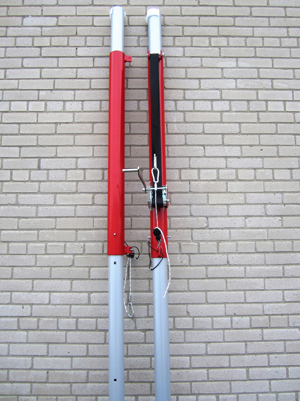 Gymnasium volleyball post system. Made of 3" aluminum and 3.5" sleeve. Slide the sleeve to obtain the desired height between 42" and 96". Insert the posts 7" deep or custom with adapter. The set includes the net with aircraft-grade steel cable covered in a vinyl sheath and two antennas with pouch.