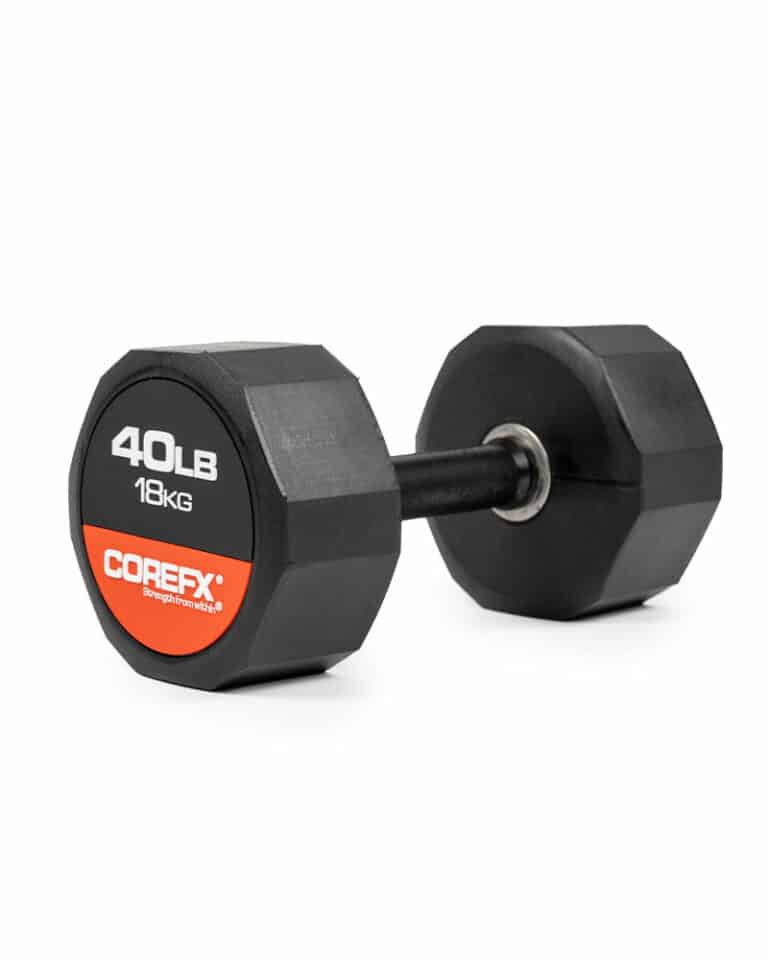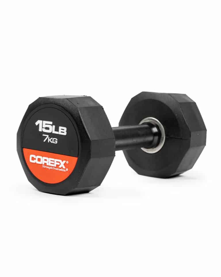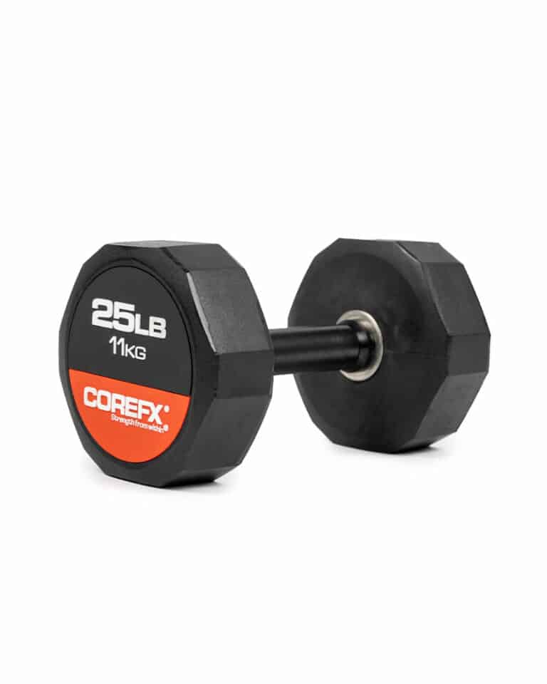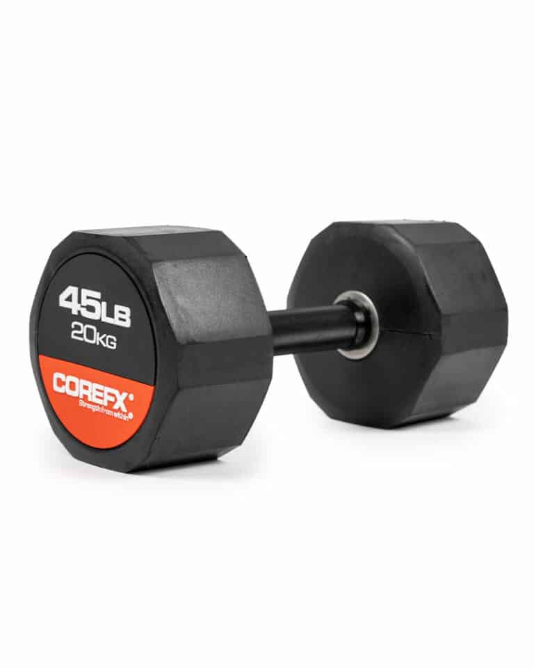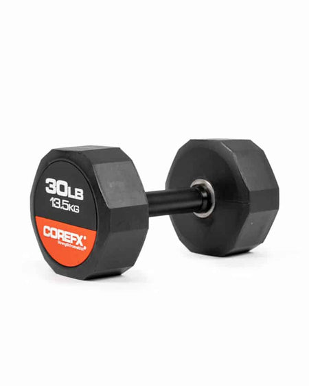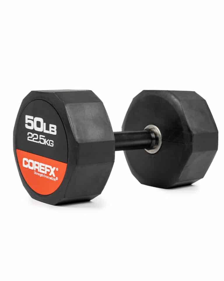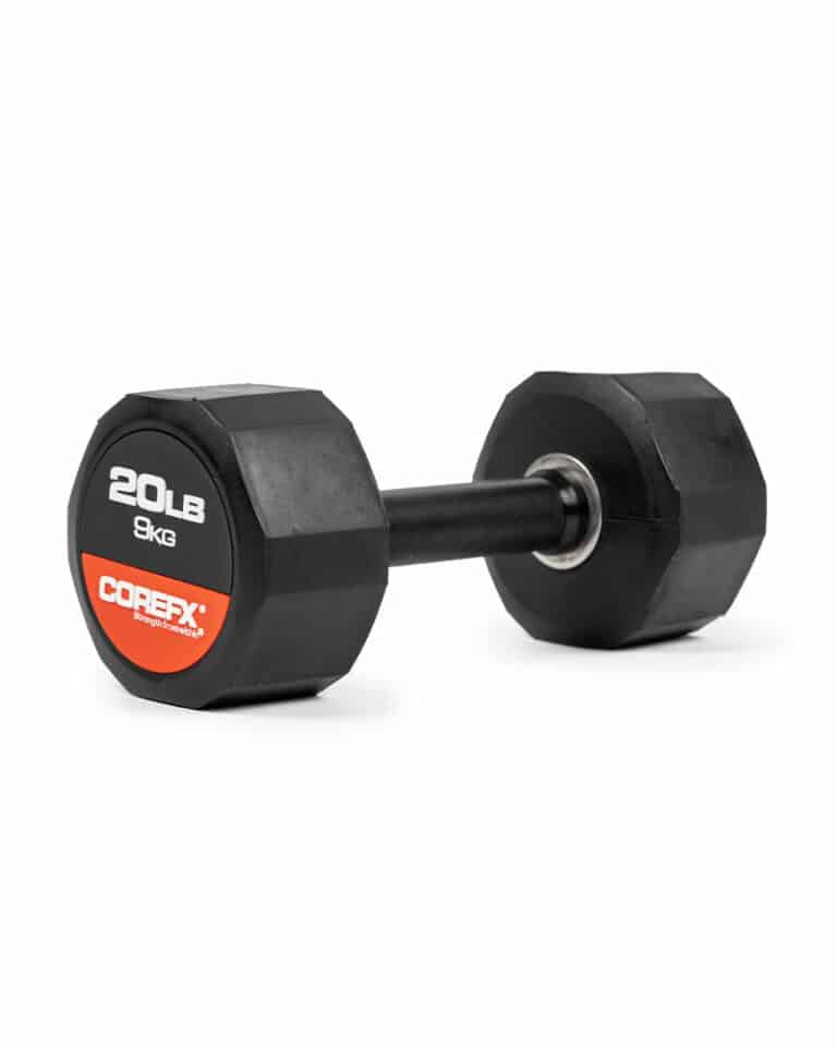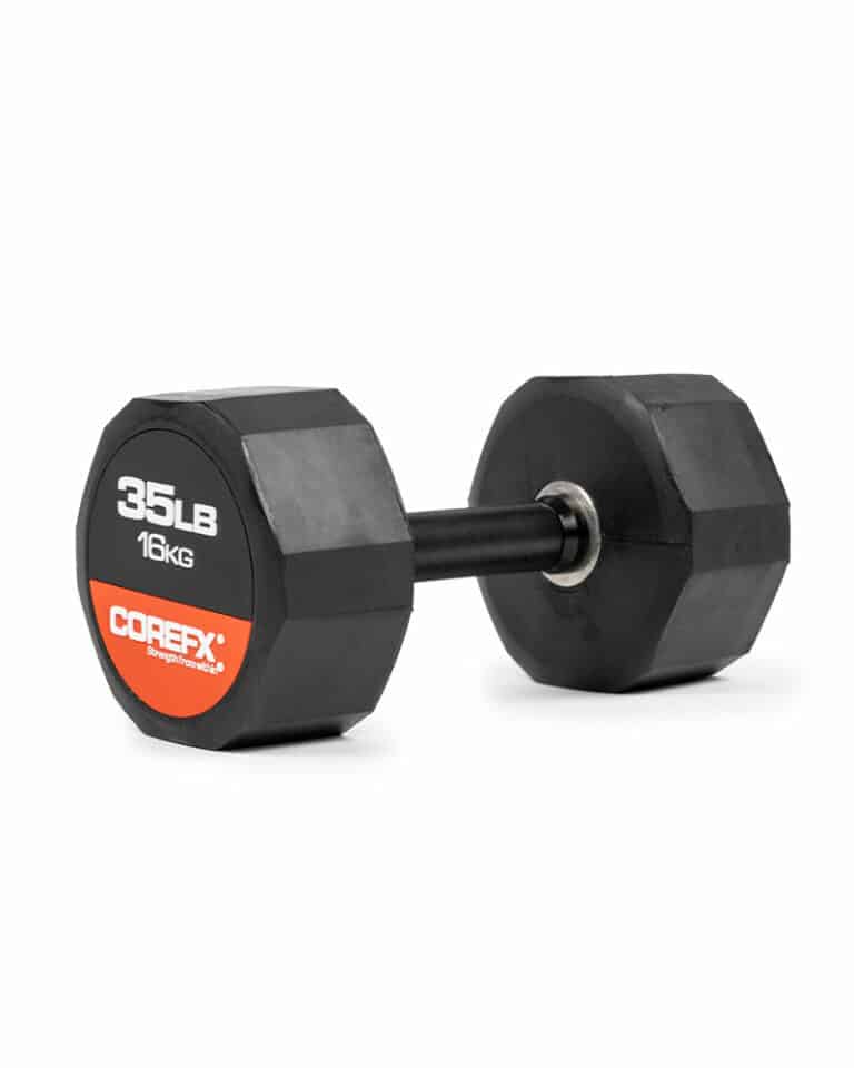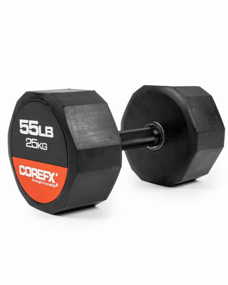 The COREFX Rubber Dumbbell is designed to protect your floors from damage and prevent the weight from rolling due to its 12-sided rubber coating. Each dumbbell ensures a secure grip during your exercises with its medium-grade knurling. (Sold as individual dumbbells)