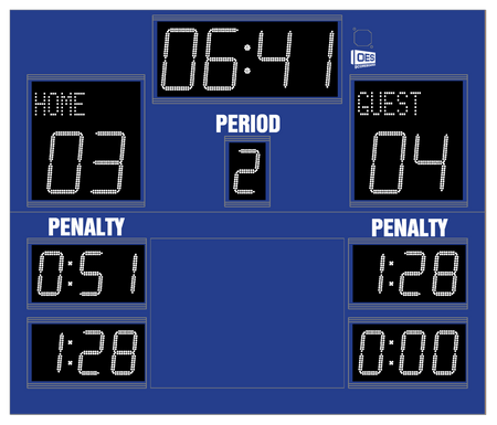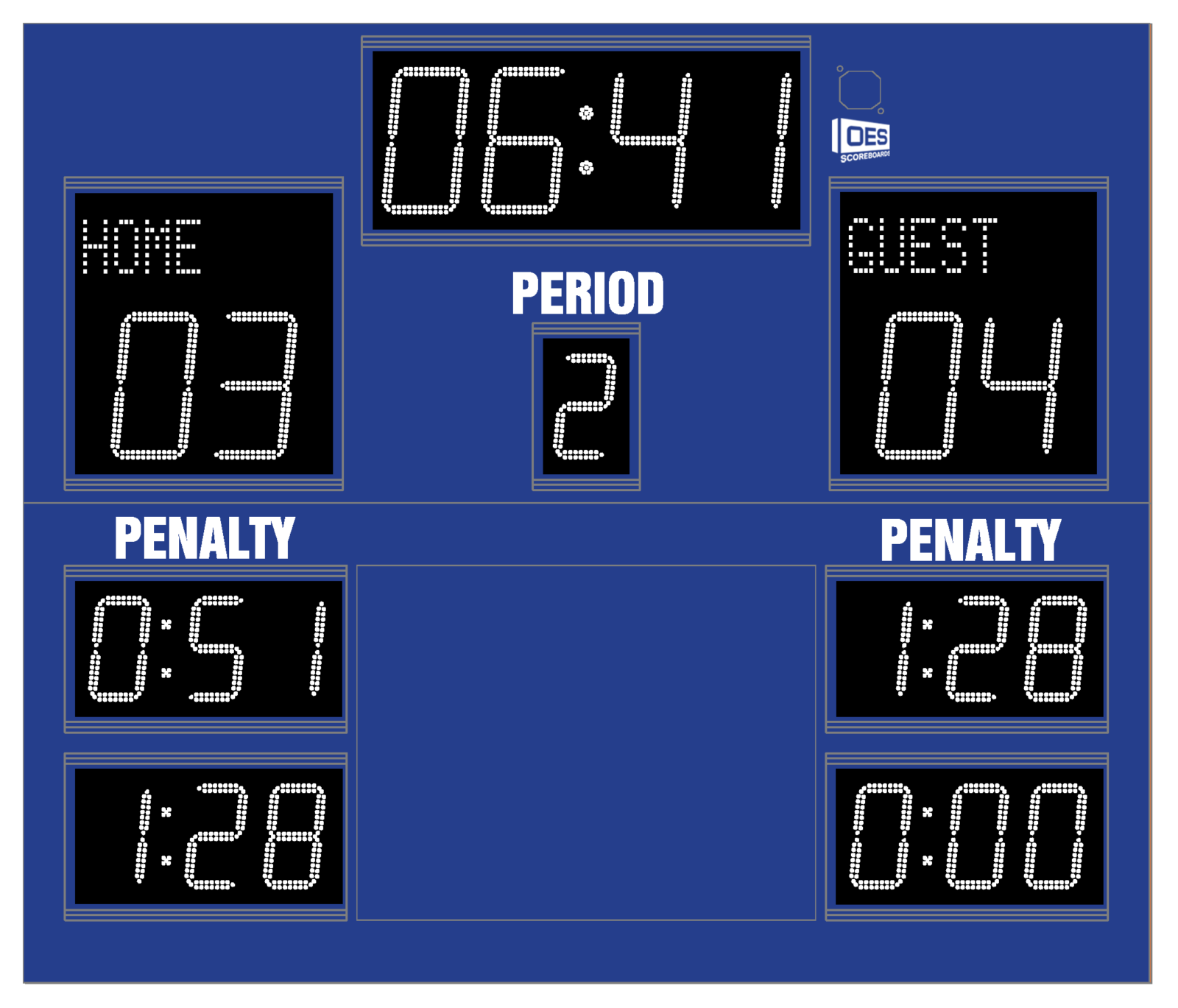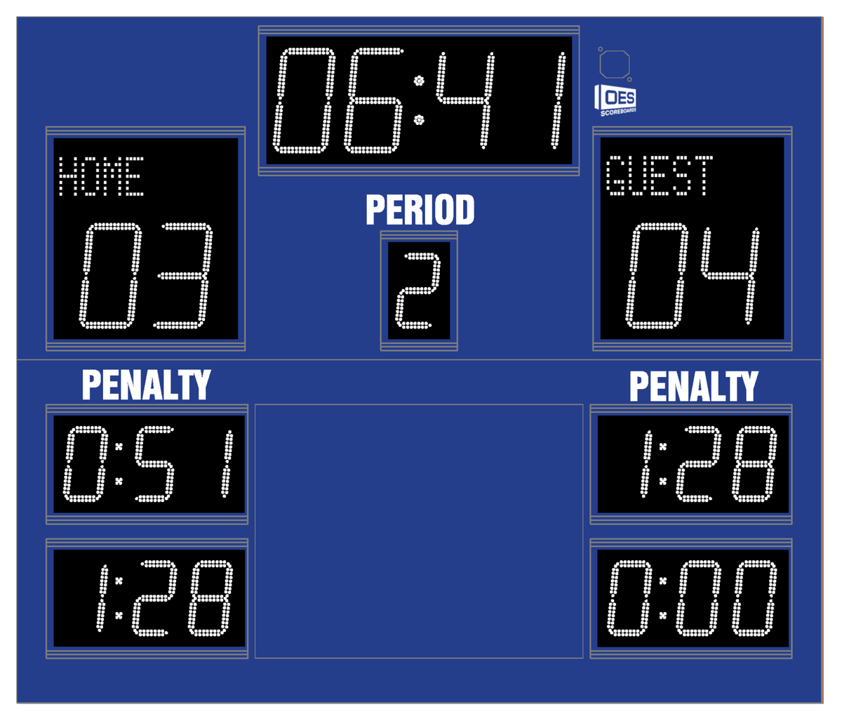 Game time up to 99:59, with home and guest scores, period, and penalty time. It also includes a built-in horn. The game time display automatically adjusts to 1/10th of a second when the clock is below 1 minute. Easily adjustable for other sports when used with an OES controller.