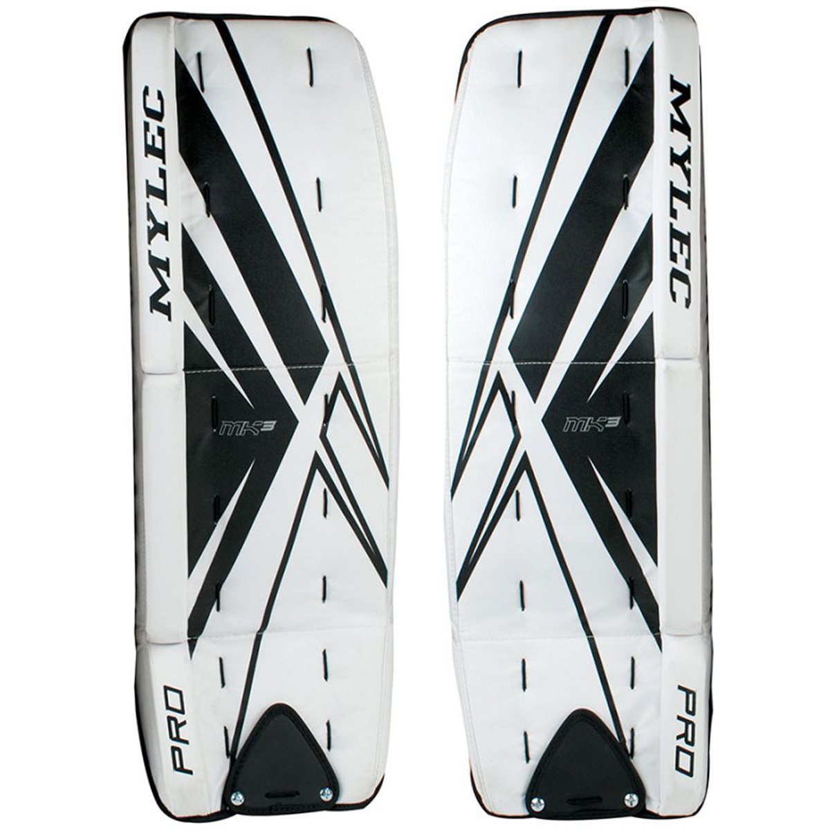 Durable nylon goalie pads, ultra-lightweight and soft foam. White / black / blue.