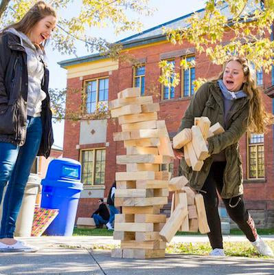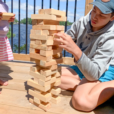 This giant wooden tower game is ideal for family fun anywhere. Bring it along easily using the included carry bag. There are a total of 58 blocks in the bag. Plenty to have fun for a long time!