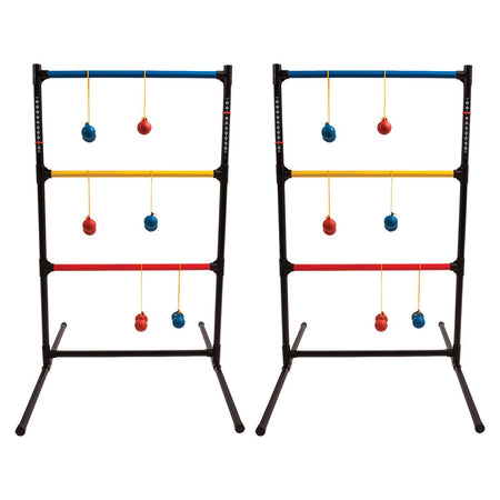 The Ladder Toss Game is a fun and easy-to-set-up skill game, perfect for the whole family. It includes two sturdy plastic ladders measuring 39" x 22" with a 33" base for excellent stability on all surfaces. Each player tosses bolas—two weighted PU foam balls connected by a rope—aiming for the colored rungs of the ladder to score points. Lightweight and convenient, this set comes with a carrying bag, making it ideal for the beach, park, or backyard.