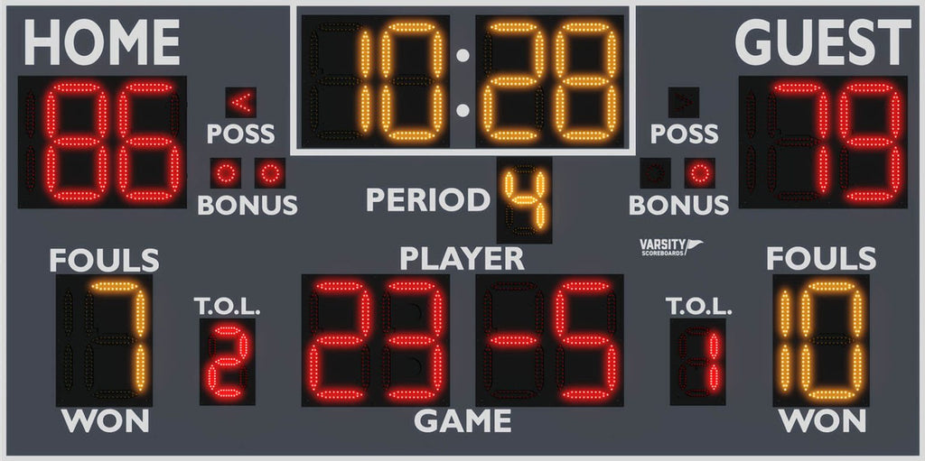 Our largest and most complete basketball scoreboard is perfect for large spaces. 15-inch LED digits with protective screens. Home/Guest score up to 199. Double bonus and possession indicators. Galvanized steel cabinet with powder coating finish.