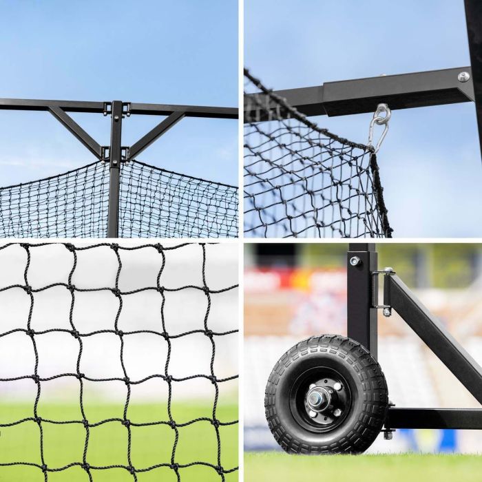 The cage is constructed from heavy-duty steel with a thickness of 40mm x 3mm. The galvanized steel structure ensures a long lifespan and prevents rust and corrosion, thanks to a black polyester powder coating. The net is made from highly durable 3mm thick twine, with a 48mm knot mesh, and UV-treated polypropylene (HDPE). The 360° lifting wheels raise/lower the cage on its 260mm diameter pneumatic wheels by turning the handle. Complete with galvanized nuts/bolts/washers.