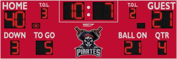 Outdoor park football scoreboard features all football game information plus a large central area for optional team name/logo. 26", 20" and 15 LED digits " with protective screens. Home/Guest score, To Go and Ball On up to 99. Clock counts down from 99:59. Galvanized steel cabinet with powder-coated finish. Exterior horn. Wireless remote control with internal rechargeable battery and high gain antenna. 5-year limited warranty.
