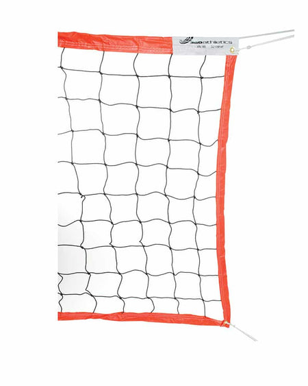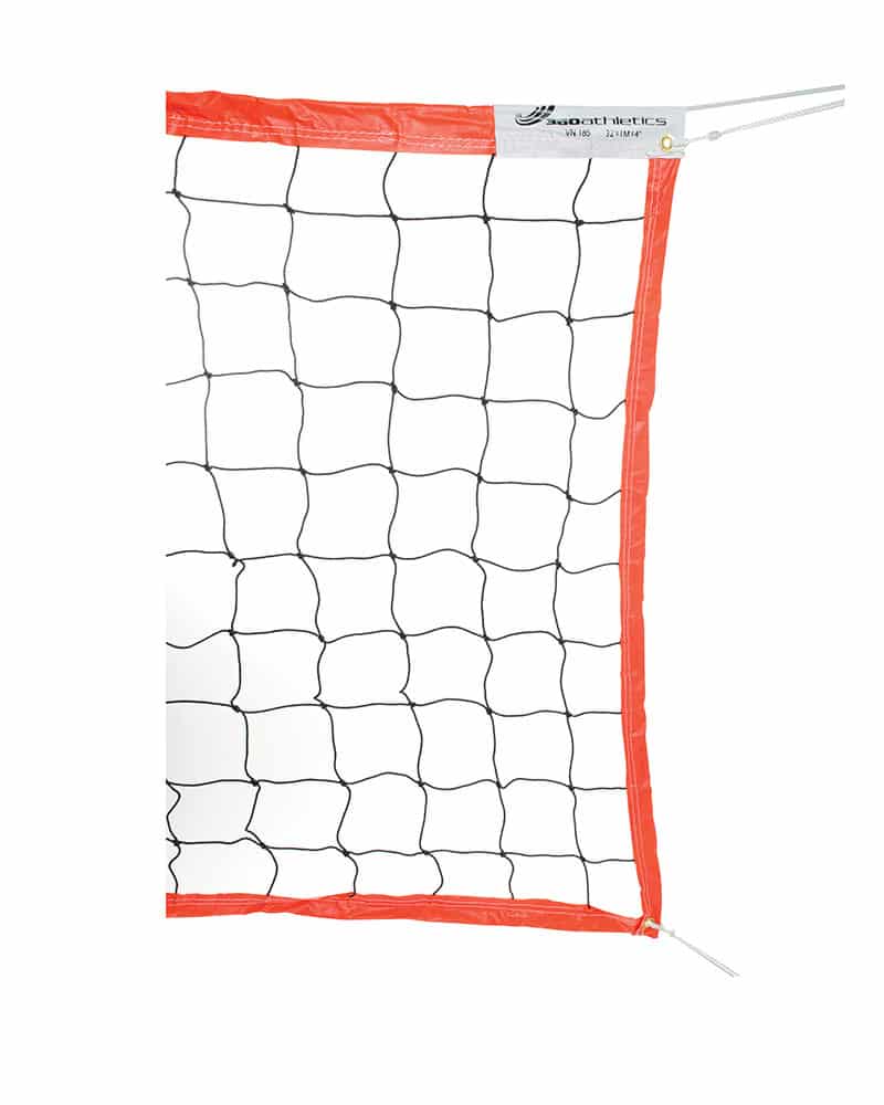 Outdoor volleyball net. Made from fully taped 2.5mm PE net with high visibility and reversible color. 4" top band with 2" sides and bottom. Available in 3 sizes, as well as rope or cable options.